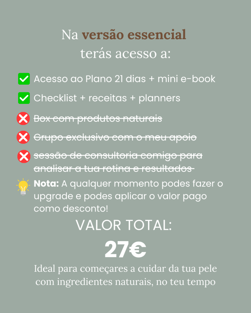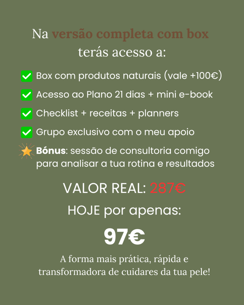 Isso ainda acontece porque há tanta informação contraditória sobre skincare natural que acabas por não saber quais ingredientes realmente funcionam, quais produtos são adequados para ti e como criar uma rotina simples e eficaz.